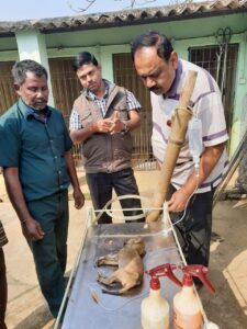 Mr. Vanoo mitra acharya, secretary, sangram, rescued a stray puppy in distress and assisting the veterinary surgeon for its treatment.