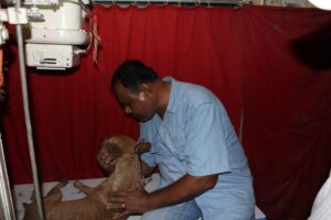 Mr. Vanoo mitra acharya, secretary, sangram, during x-ray of a stray dog who sustend grave injuries in an accident.